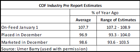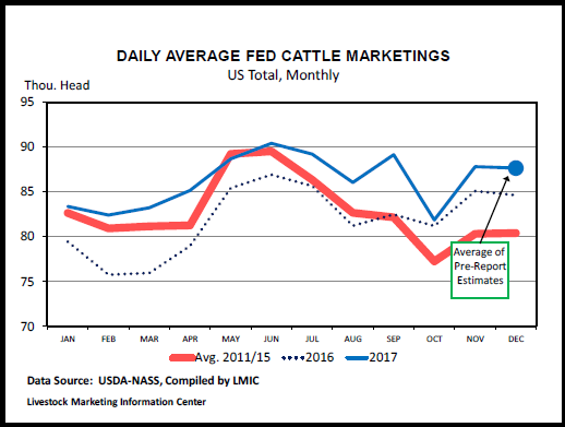 許多分析者預(yù)測12月份進(jìn)入育肥場的育肥牛數(shù)量同比會(huì)下降。2016年12月的存欄量是自2010年以來量最大的月份, 最近幾個(gè)月的存欄量也一直很大。 然而,如果在報(bào)告中會(huì)有一個(gè)出乎預(yù)料的數(shù)據(jù)的話,應(yīng)該是存欄量會(huì)高于報(bào)告前預(yù)測的平均水平(只有前一年的96.9%)如果12月的存欄量符合報(bào)告前預(yù)測的平均值,在2017年第四季度(10月-12月)進(jìn)入育肥場的??倲?shù)同比增幅7.5%(433,000頭),是2012年以來同期最大量。