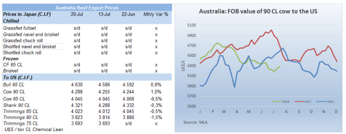 今年屠宰率減少的趨勢(shì)會(huì)延續(xù)到后面幾個(gè)月,所以預(yù)計(jì)2018年屠宰量會(huì)比去年的232萬(wàn)頭減少10萬(wàn)頭。天氣狀況對(duì)今年活牛供應(yīng)情況起決定性作用,夏季干旱會(huì)使活牛緊缺持續(xù)到十月份,6月30號(hào)統(tǒng)計(jì)的閹牛存欄量大幅減少,甚至都不像一個(gè)牛肉生產(chǎn)大國(guó)的數(shù)據(jù),這主要是近幾年的活牛尤其是小公牛出口導(dǎo)致的。