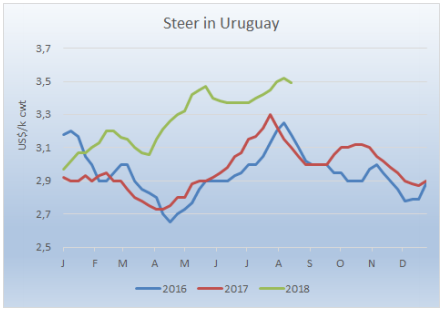 美國(guó)和土耳其的政治危機(jī)嚴(yán)重影響到了新興國(guó)家的貨幣,南方共同市場(chǎng)各國(guó)也受到了影響,本地閹牛均價(jià)被拉低。本周南方共同市場(chǎng)閹牛指數(shù)降低了6美分到2.66美金/公斤,近四周最低。前期由于本地牛價(jià)上漲以及貨幣貶值趨緩,美金牛價(jià)逐漸恢復(fù),此趨勢(shì)被打破,阿根廷比索對(duì)美元貶值8.2%,巴西雷亞爾貶值3.6%。巴西本地育肥牛價(jià)漲到137.1雷亞爾,漲幅0.8雷亞爾,但換算成美元降低了7美分到2.34美金,阿根廷情況也一樣,出口閹牛價(jià)格漲了1比索,但由于貨幣貶值,美金價(jià)減少了17美分至2.57美金。烏拉圭牛價(jià)也顯示出降低趨勢(shì),因?yàn)楠q太團(tuán)隊(duì)即將撤離,開(kāi)始為481配額準(zhǔn)備牛肉生產(chǎn)。本地區(qū)只有巴拉圭一個(gè)國(guó)家牛價(jià)上漲,漲了5美分。