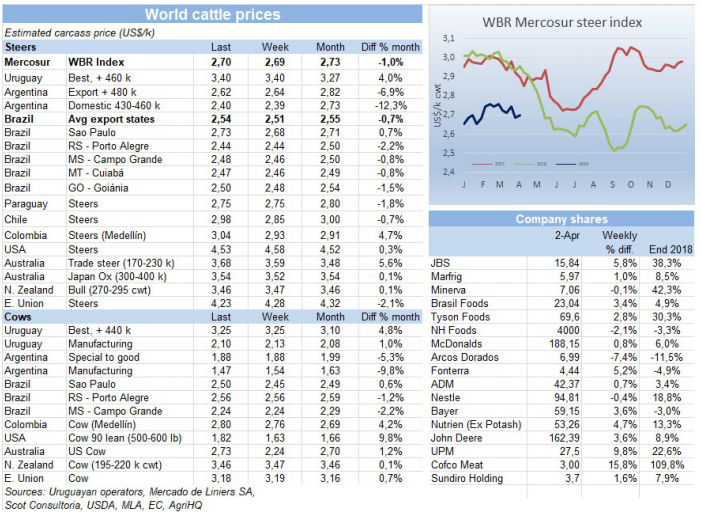 第一季度烏拉圭對歐盟出口了9535噸冷鮮牛肉,同比增長1%,因為希爾頓配額價格下跌,平均離岸價跌了4%到9367美金,而冷凍牛肉市場反應冷淡,三月出口817噸,第一季度2877噸,同比減少42%,離岸均價6532美金,同比下跌11%。烏拉圭18/19農(nóng)業(yè)年希爾頓和481配額出口量都有所下降,截止到3月22日,希爾頓配額出口量4905噸,同比減少5.5%,481配額出口9961噸,同比減少13.5%,希爾頓配額離岸均價跌了9.8%到10628美元,而481配額均價跌了2.9%到9417美元。