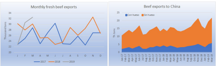 中國市場作為烏拉圭牛肉最主要的買家份額還在增長,三月份共進口21511噸牛肉,占烏拉圭總出口量32458噸的66%,創(chuàng)下新的月度紀錄,中國采購了6071噸帶骨和15440噸去骨牛肉。第一季度帶骨牛肉銷售量漲了18%,而去骨牛肉漲了31%,均價也有增加,帶骨均價3246美金離岸價,上漲9%,去骨牛肉4512美金離岸價,上漲4%。北美市場,主要是美國市場排名第二,第一季度共進口12880噸牛肉,同比增長12%。三月份以色列市場排第三,進口1071噸,但進口量同比跌了68%。