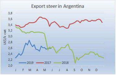 出口閹牛價(jià)格連續(xù)兩周保持穩(wěn)定,母牛價(jià)格上漲,最好的英國(guó)種閹牛在115-123比索上下,印度串種牛112-118比索,優(yōu)種和良種母牛價(jià)格上漲1比索/公斤,達(dá)到95-100比索。