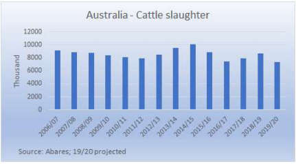 澳洲牛只屠宰量、牛肉產量和出口量2019/20年將會減少