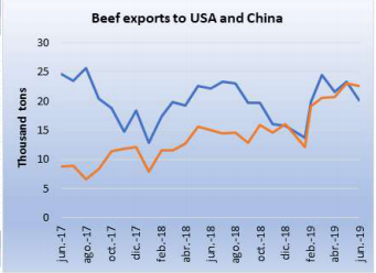2019/20農業(yè)年前兩周阿根廷工廠已經發(fā)運了1847噸希爾頓牛肉,比巴拉圭全年發(fā)運的量還多一倍,也達到了烏拉圭配額量的30%,不過還需要觀察在國際價格下跌、對美元匯率貶值以及本地消費減少的情況下市場會如何發(fā)展。