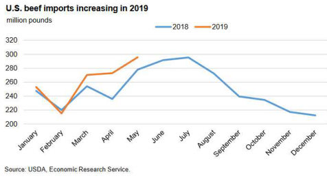 根據(jù)USDA最新預(yù)測(cè),明年美國(guó)牛肉和豬肉進(jìn)口量會(huì)減少,羊肉進(jìn)口量保持不變,大洋洲由于天氣原因存欄減少,牛肉供應(yīng)量持續(xù)減少,預(yù)計(jì)美國(guó)牛肉進(jìn)口量會(huì)減少3%,由于中國(guó)市場(chǎng)非洲豬瘟導(dǎo)致的高需求,以及全球豬肉供應(yīng)減少,美國(guó)豬肉進(jìn)口量預(yù)計(jì)會(huì)減少4%,美國(guó)國(guó)內(nèi)牛肉和豬肉產(chǎn)量分別會(huì)提高1.1%和2.8%,也減少了對(duì)進(jìn)口肉的需求。2019年美國(guó)牛肉進(jìn)口量增加,五月進(jìn)口量達(dá)到2.96億磅,同比增加6%,除了新西蘭外其他國(guó)家對(duì)美國(guó)出口量都增加,其中澳洲前五個(gè)月出口量同比增加14%,主要因?yàn)榻衲晟习肽臧闹尥涝琢吭黾印?span>
