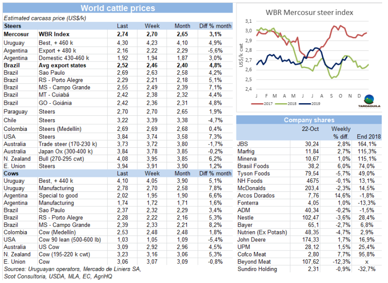 上周牛屠宰量減少是由于草飼牛只短缺和降水引起的裝運(yùn)困難。烏拉圭肉協(xié)報道,10月19日,被批準(zhǔn)的加工廠牛只屠宰量總計33398頭,比上周減少3379頭,減少了9.2%,比去年同期減少10000頭。在周對比中,母牛屠宰量減少3000頭,減少至12906頭。閹牛屠宰量減少1100頭,幼母牛屠宰量增加818頭,增加至5724頭。屠宰量最大的廠是 Minerv-PUL(3779頭),Las Piedras(3114頭),Marfrig-Colonia(2984頭)。Marfrig四家工廠自前一周起共屠宰10478頭牛,Minerva僅PUL一家廠進(jìn)行屠宰活動。10月截至目前,牛只屠宰量96137頭,比去年同期減少22.8%,考慮到上周因降水造成的延誤,本周屠宰量將有增長。但無論如何10月屠宰量與2018年的20.1萬頭相比將減少3.6-3.8萬頭。這將是2013年以來10月份的最低水平。