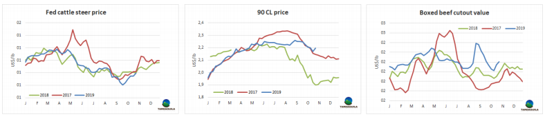 雖然不能肯定世界上主要牛肉出口國的牛的生產(chǎn)周期均同步,但其中大多數(shù)國家的牛存欄已經(jīng)停止增長或開始下降。在南方共同市場國家中,2018年巴西、巴拉圭、烏拉圭牛只存欄減少,只有阿根廷存欄增加??傮w,與去年相比減少163萬頭,減少了0.6%,減少至2.923億頭。據(jù)統(tǒng)計,巴西牛只存欄2.135億頭,2018年是連續(xù)第二年存欄減少,比上年減少1.7%。烏拉圭去年牛只存欄也是連續(xù)第二年減少,2019年減少趨勢繼續(xù)。巴拉圭牛只減少32萬頭,減少至1350萬頭,2019年第一季度有一定數(shù)量的恢復(fù)。阿根廷盡管2019-2020存欄計算年剛過去一半,預(yù)計母牛和幼母牛數(shù)量減少1.5%-2%,這可能被閹牛、小公牛、牛犢數(shù)量的增長抵消因此到明年三月總存欄將與2019年同時期數(shù)量相當(dāng)。2017-2018年阿根廷牛只存欄增長57.5萬頭,增長至5990萬頭。其他牛肉出口大國情況類似,美國7月1日牛只存欄不景氣,1.03億頭,母牛和牛犢數(shù)量穩(wěn)定。歐盟牛只從2017年的8915萬頭減少至2019年的8750萬頭,減少了1.85%。澳大利亞受干旱的嚴(yán)重影響,今年牛只存欄減少3.8%,預(yù)計明年存欄2450萬頭,達(dá)31年來最低,2020年斷奶牛犢數(shù)量將減少至1985年來最低??偟膩碚f,從世界上主要的牛肉出口地區(qū)來看,以產(chǎn)量的增長來彌補(bǔ)由于非洲豬瘟在中國和其他亞洲國家的流行而導(dǎo)致的需求增長是不可能的。