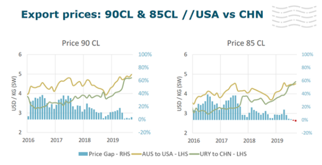 “2020年我們要將進(jìn)口集中在中美洲國(guó)家和墨西哥”一位進(jìn)口商在美周進(jìn)口肉類委員會(huì)年度會(huì)議上說。由于該會(huì)議與中國(guó)舉辦的進(jìn)博會(huì)時(shí)間沖突,來自澳洲和南美的出口商代表團(tuán)數(shù)量很少,來自烏拉圭的肉類代表Las Piedra 和San Jacinto, Marfrig和Minerva多個(gè)國(guó)家的代表、以及貿(mào)易公司的代表參加了此次大會(huì)。會(huì)議上,烏拉圭肉協(xié)強(qiáng)調(diào)了牛肉到中國(guó)和美國(guó)的出口價(jià)格差異越來越小,澳洲牛肉到中國(guó)和美國(guó)的出口價(jià)格差異也越來越小,2019年差距已經(jīng)趨于零差距。甚至出口到中國(guó)的85CL和90CL產(chǎn)品價(jià)格開始高于美國(guó)。出口商還提到了出口到中國(guó)的低成本、低門檻的問題,2016年-2017年,美國(guó)采購(gòu)價(jià)格比中國(guó)高30%。