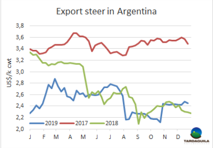 除了關(guān)于出口稅的許多未知因素外,還有一些人觀察到這種額外的稅率可能會引起該行業(yè)的自我凈化。Cofrigo經(jīng)理表示,出口稅的增加可能會使所謂的屠宰經(jīng)銷商的業(yè)務(wù)復(fù)雜化?!澳壳?,經(jīng)銷商在利涅爾斯買牛(額外成本5%),在第三方工廠屠宰(250美元額外成本),在代宰工廠或另一個工廠加工(200美元額外成本),存儲在另一家工廠中(短途貨運要多付50美元),全部加上相應(yīng)的增值稅,再加上沒有受過訓(xùn)練的人員的低質(zhì)量低效率的作業(yè)(我估計至少損耗5%),總計約900美元。這將使出口業(yè)務(wù)很難進行,如果他們無法收回增值稅,那就更糟糕。我認為,這種價格變化的過程,將使許多沒有工廠、也沒有固定結(jié)構(gòu)、能源、勞動力等成本的局外人,以及許多沒有真正出口業(yè)務(wù)的“新”公司,重新思考自己的未來。出口商必須在每個階段都努力工作,保證盈利。”