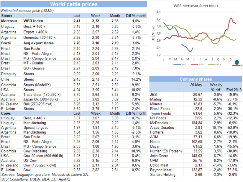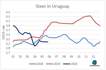 在公布四月的閹牛類型價值數(shù)據(jù)時,烏拉圭肉協(xié)做了一些澄清,強(qiáng)調(diào)“在當(dāng)前條件下,平均工廠增值價值無法覆蓋工廠成本”。4月閹牛類型價值每頭較3月下跌了85美元,下跌至1162美元,達(dá)2019年5月以來最低。2019年5月中國進(jìn)口價格開始飆升。牛只的平均采購價格急劇下降,每頭降了120美元,降至835美元。因此,每頭牛的增值價值(兩者之間的差額,即工廠必須支付的其他成本,并最終獲得的收益)增加了35美元,至327美元,這是自2017年12月以來的最高水平。烏拉圭肉協(xié)提醒,閹牛類型價值只反應(yīng)“計算時可用的統(tǒng)計數(shù)據(jù),不包括一些出口合同中額外的變化?!边@里是歐洲進(jìn)口商與一些工廠就3月成交的481配額合同議價的情況。此外,烏拉圭肉協(xié)還稱,屠宰活動極少時銷售額同樣不足以支撐成本。閹牛類型價值的降低是由于出口部位肉、牛雜碎、牛副、鮮皮等價格下跌,國內(nèi)市場胴體價格大體保持不變(所有價格按美元計)閹牛類型價值是對480公斤活重出成率54%的英國純種閹牛或其雜交品種所產(chǎn)出的所有產(chǎn)品的平均價值總和的估算。