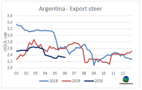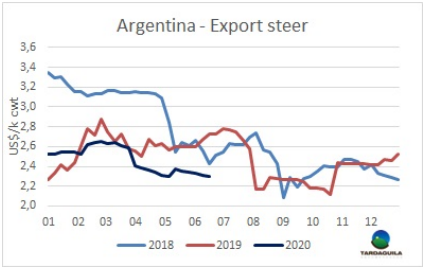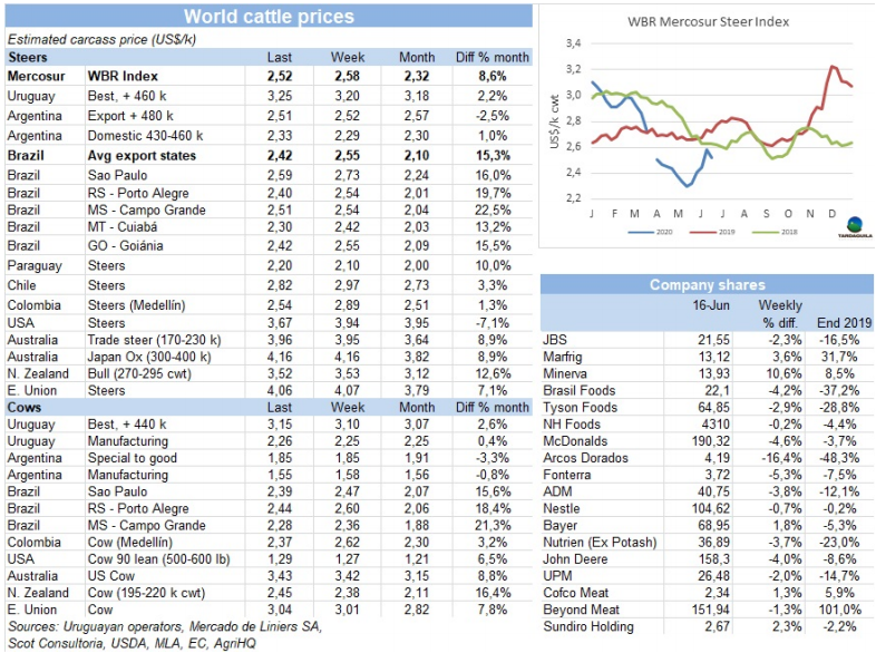 5月閹牛類型價值降低至1123美元,達(dá)2019年4月至今13個月以來最低。相反,閹牛采購價格上漲了52美元,增長至887美元,因此兩者之間的差即工業(yè)附加價值大幅下降,每屠宰一頭牛的工業(yè)附加價值下降236美元。烏拉圭肉協(xié)稱閹牛類型價值降低的原因是所有部位肉價格都有下降,出口方面,高價值的部位肉出口至歐洲市場困難導(dǎo)致價格下跌。國內(nèi)市場胴體、雜碎和副產(chǎn)品的美元價格也在下跌。閹牛類型價值是對一頭重480公斤,產(chǎn)量54%的英國品種閹牛?;螂s交品種的所有產(chǎn)品和副產(chǎn)品的貿(mào)易價值的加權(quán)平均值。