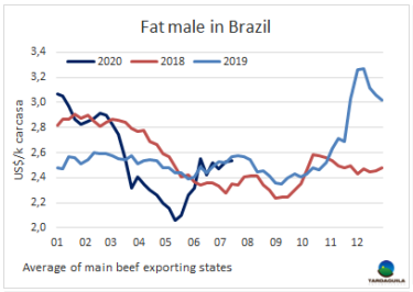美國農(nóng)業(yè)部表示,由于巴西、中國和北美的屠宰量低于預(yù)期,2020年的全球產(chǎn)量預(yù)測(cè)比之前的預(yù)測(cè)下調(diào)了1%。暫時(shí)的生產(chǎn)中斷導(dǎo)致加拿大和美國的產(chǎn)量預(yù)期下調(diào),而面對(duì)激烈的進(jìn)口競(jìng)爭(zhēng),中國牛肉產(chǎn)量的同比增幅也有所下調(diào)。同時(shí),巴西國內(nèi)牛肉需求低迷,牛價(jià)下跌,導(dǎo)致生產(chǎn)者推遲屠宰。
