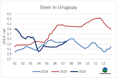 上周牛屠宰量有緩慢恢復(fù)。烏拉圭肉協(xié)報(bào)道,截止7月11日的一周內(nèi),牛屠宰量35496頭,較上周增長1849頭,增加了5.5%,增長的主要因素是閹牛屠宰量的增長,去年同一周牛只屠宰量37294頭。屠宰量最大的是閹牛,18619頭,占屠宰總量的52.5%,較上周增長1787頭,增長了10.6%。母牛屠宰量增加了3%,增長至12419頭。小母牛屠宰量減少了5.4%,減少至4015頭。閹牛屠宰活動(dòng)較去年同期增加,母牛屠宰量較去年同期減少。屠宰量最大的工廠是Marfrig-Tacuarembó (4931頭),是該工廠2010年11月至今10年以來最大周屠宰量。排在第二第三位的兩家工廠是美麗華的PUL廠(3851頭)和 Carrasco(3826頭)。