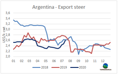 巴西屠宰活動(dòng)穩(wěn)定,阿根廷成為南方共同市場(chǎng)閹牛平均價(jià)格上漲的主要推手。本周南方共同市場(chǎng)閹牛價(jià)格指數(shù)上漲4美分,上漲至2.69美元/公斤。隨著歐洲冰鮮牛肉產(chǎn)品價(jià)格上漲,本周阿根廷閹牛出口價(jià)格上漲10比索/公斤,美元價(jià)格,加上9%的出口稅,達(dá)2.83美元/公斤,一周內(nèi)上漲14美分。烏拉圭牛價(jià)上漲5美分/公斤,上漲至3.4美元/公斤。巴西和巴拉圭活牛參考價(jià)保持穩(wěn)定,分別為2.53美元/公斤和2.4美元/公斤。