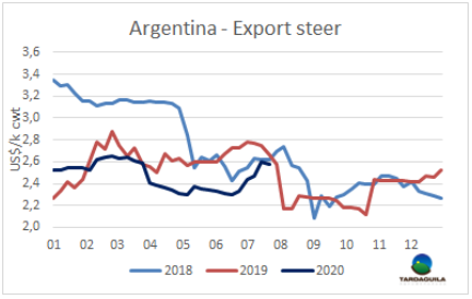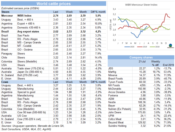 歐盟昨日宣布的大規(guī)模經(jīng)濟(jì)刺激計(jì)劃,以及新冠肺炎疫苗研制進(jìn)展的利好消息,帶動(dòng)了市場(chǎng)的樂觀情緒,推高了主要股指,新興國(guó)家貨幣也有升值。昨天巴西雷亞爾增值2.4%,較一周前增值3%,促進(jìn)牛價(jià)堅(jiān)挺。巴西主要出口州育成牛雷亞爾平均價(jià)格上漲了0.7%,美元價(jià)格上漲0.9美分,上漲至2.62美元/公斤。巴拉圭和烏拉圭牛價(jià)保持冬季一直以來的上行趨勢(shì)。巴拉圭閹牛報(bào)價(jià)2.45美元/噸,烏拉圭牛價(jià)要高出1美元,3.43美元/噸。阿根廷出口閹牛比索價(jià)格與上周保持不變,由于比索官方匯率珠江下跌,美元價(jià)格下跌2美分至2.81美元/公斤。南方共同市場(chǎng)活牛價(jià)格指數(shù)本周上漲5美分,上漲至2.74美元/公斤。