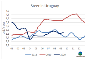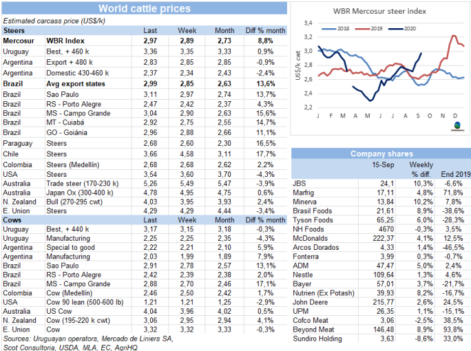 中國市場(chǎng)有需求,盡管一些進(jìn)口商的采購仍然很謹(jǐn)慎,聲稱市場(chǎng)上現(xiàn)貨庫存仍然很大。然而接受采訪的市場(chǎng)參與者均表示整體趨勢(shì)更加樂觀了。一些中國進(jìn)口商已經(jīng)開始為下一個(gè)春節(jié)做準(zhǔn)備,船期必須要保證在10月至12月之間。巴西出口商稱中國主港和香港的需求都更加強(qiáng)勁了,香港前后腱成交價(jià)4600美元/噸,價(jià)格還有可能成交到更高的水平。水漂市場(chǎng)牛副價(jià)格和需求都有所上漲。一位業(yè)內(nèi)人士稱收到中國方面對(duì)牛前的還價(jià)4800美元/噸,但活牛價(jià)格非常高,即使價(jià)格在這一水平,也很難成交。另一方面烏拉圭羊肉的需求旺盛,但成交仍需謹(jǐn)慎,因?yàn)榛钛驍?shù)量不足,很可能讓價(jià)格停止上漲。同時(shí)巴拉圭出口商強(qiáng)調(diào)近幾個(gè)月臺(tái)灣方面的進(jìn)口價(jià)格和需求水平都更穩(wěn)定了,前后腱成交價(jià)范圍在3500-3800美元/噸,肩胛背肩成交價(jià)3500-3600美元/噸,也有一些后部位肉和牛柳賣到臺(tái)灣市場(chǎng)。
