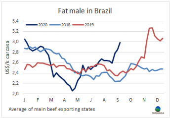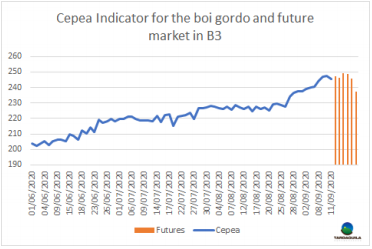 巴西主要出口州育成牛平均價(jià)格自六月初價(jià)格開始上漲以來上漲了30%。受供應(yīng)短缺和出口需求尤其是中國市場(chǎng)需求強(qiáng)勁的影響,與去年九月中相比,上漲接近60%。本周巴西主要出口州育成牛價(jià)格上漲至237雷亞爾/15公斤,30天付款,免運(yùn)費(fèi)。期貨市場(chǎng)參考價(jià)Cepea育成牛價(jià)格指數(shù)為245.65雷亞爾/15公斤。較本周中間幾天247雷亞爾/15公斤的最高價(jià)有輕微下降。略低的價(jià)格影響育成牛期貨價(jià)格輕微下行。預(yù)計(jì)當(dāng)前的價(jià)格將保持堅(jiān)挺,因?yàn)槭袌?chǎng)仍是然以供應(yīng)端為主導(dǎo)。但價(jià)格的上行趨勢(shì)將結(jié)束。11月和12月價(jià)格預(yù)計(jì)將達(dá)250雷亞爾/15公斤,到2021年五月價(jià)格將達(dá)237雷亞爾/15公斤。