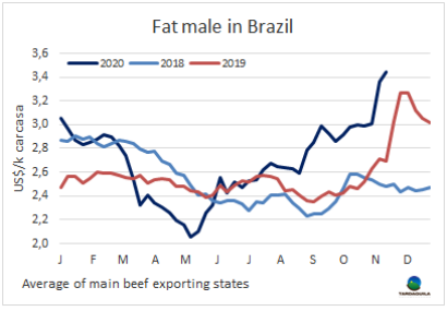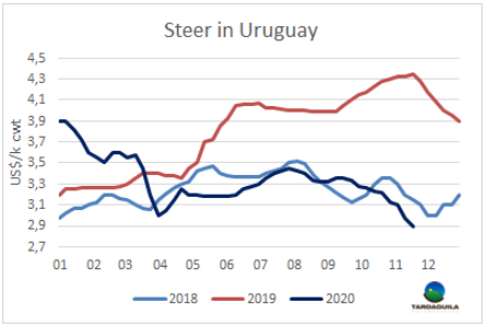 南方共同市場閹牛價格指數(shù)本周再次上漲4美分,上漲至3.22美元/公斤,達2019年11月至今一年以來最高。影響閹牛價格指數(shù)上漲的主要因素還是巴西牛價,盡管近幾周來上漲趨勢有可能停止的跡象。股市指標大幅上升,包括雷亞爾在內(nèi)的新興國家貨幣也大幅上升。巴西主要出口州育成牛價格本周上漲8美分,上漲至3.44美元/公斤,拉大了與其他地區(qū)的差距。巴西牛價上漲是由于本地牛價上漲和匯率上漲導(dǎo)致的。阿根廷和巴拉圭牛價保持堅挺,本周上漲2美分,阿根廷出口閹牛價格上漲至2.98美元/公斤,包含9%的出口稅。巴拉圭牛價保持2.95美元/公斤。烏拉圭牛價下行趨勢仍然持續(xù),草飼閹牛2.9美元/公斤,較阿根廷僅高1美分,阿根廷牛價仍為南美地區(qū)最低。