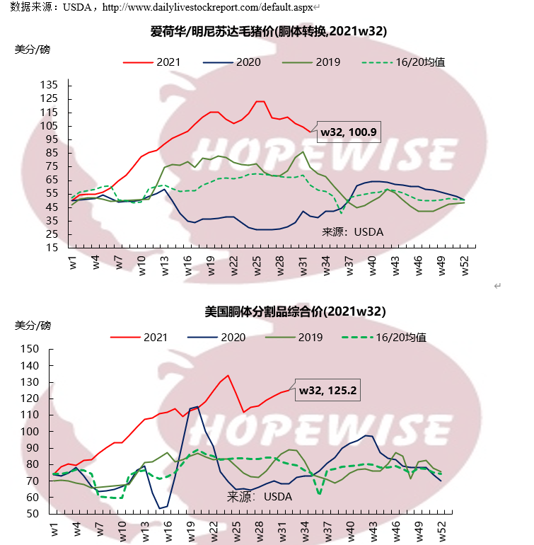 美國7月生豬均價109.10美金/百磅,環(huán)比下滑7.31%,同比上漲229.61%。豬胴體分割品綜合價119美金/百磅,環(huán)比下滑4.72%,同比上漲76.56%。由于屠企缺少工人,生豬價格下滑;而細分割品價格高企,助推豬胴體價格上漲。勞動力短缺成為生豬價格和豬胴體價格存在差異的主要因素。周均屠宰量222.58萬頭,環(huán)比減少3.5%,同比減少9.51%。養(yǎng)殖成本方面,玉米均價6.4美金/蒲式耳,環(huán)比下滑3.03%,同比上漲100%。大豆均價14.6美金/蒲式耳,環(huán)比下滑0.68%,同比上漲62.22%。