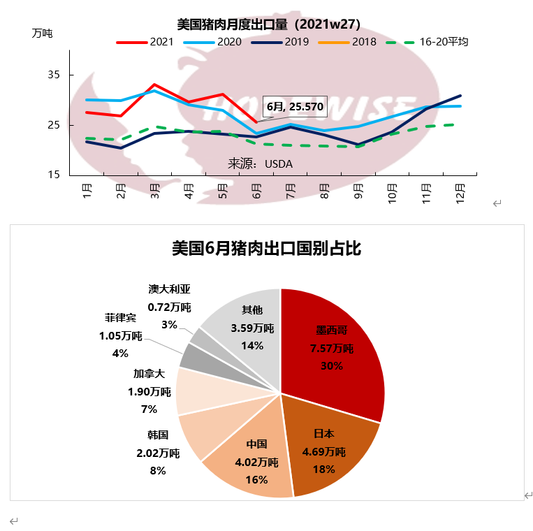 美國6月豬肉出口25.57萬噸,環(huán)比減少18%,同比增加9%。其中,出口墨西哥7.57萬噸,環(huán)比增加1%,同比增加52%,占6月美國豬肉出口總量的52%。出口中國4.02萬噸,環(huán)比減少45%,同比減少48%,占比16%。出口日本4.69萬噸,環(huán)比減少9%,同比增加38%,占比18%。強勁的墨西哥進口需求不足以抵消中國進口的下降。日本進口量超過中國,躋身第二大美國豬肉出口目的國。出口韓國2.02萬噸,環(huán)比減少21%,同比增加31%,占比8%。