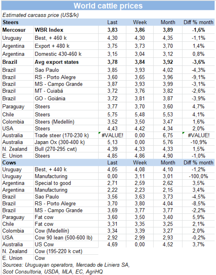 南方共同市場(chǎng)閹牛價(jià)格指數(shù)連續(xù)第二周上漲,本周下降了3美分至3.83美元/公斤。巴西牛價(jià)疲軟下跌,烏拉圭牛價(jià)穩(wěn)定,阿根廷和巴拉圭牛價(jià)穩(wěn)中有漲。