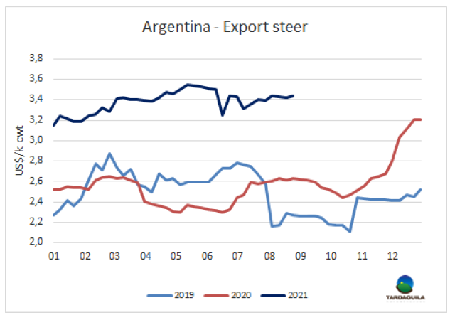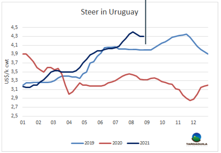 育肥牛市場(chǎng)保持下行趨勢(shì),或?qū)⒊掷m(xù)數(shù)周。據(jù)被問詢的市場(chǎng)參與者反映,大多數(shù)工廠備貨充足,期貨采購時(shí)間拉長(zhǎng),有些工廠甚至開始買九月前10天的牛。這種情況下工廠壓價(jià)幾美分,只要生產(chǎn)者可以接受,價(jià)格會(huì)繼續(xù)下跌。本周用于出口的特種閹牛參考價(jià)4.3美元/公斤,國內(nèi)市場(chǎng)的閹牛參考價(jià)4.25美元/公斤,肉母牛4.05-4.15美元/公斤,牛供應(yīng)量仍很少,預(yù)計(jì)15天之后隨著天氣變化和烏拉圭南部的降雨來臨活牛供應(yīng)將增加。