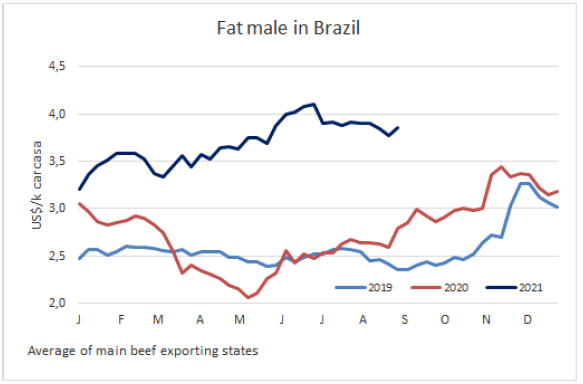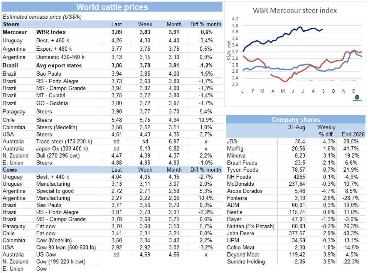 埃及進(jìn)口商繼續(xù)減少向巴西的牛肉采購量。一位巴西出口商表示,工廠正在試圖穩(wěn)住育肥牛價(jià)格的回落,看看前部位肉和后部位肉的銷售是否能更平衡一些。另一個(gè)阻礙新業(yè)務(wù)發(fā)展的因素是,通常在月初巴西國內(nèi)市場堅(jiān)挺,加之下周二(7日)是獨(dú)立日假期,市場表現(xiàn)更為堅(jiān)挺。