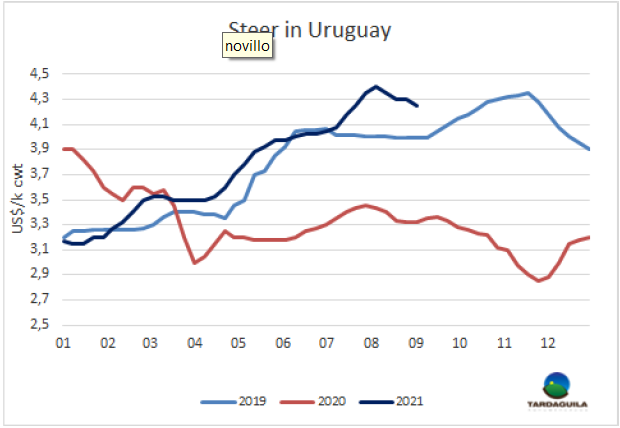 自8月初價(jià)格達(dá)歷史最高水平以來,育肥牛市場一直保持著溫和的下跌趨勢。一方面,有些人認(rèn)為供應(yīng)略有增多,另一方面,需求端非常關(guān)心是否可以找到集裝箱把已完成的產(chǎn)量運(yùn)走。有工廠稱未來幾天甚至幾周由于裝運(yùn)延誤可能將被迫減產(chǎn)。美麗華決定可能從下周中旬開始停止在3廠的生產(chǎn),并讓員工休假直到10月初。Marfrig還在評估暫停55廠的屠宰活動,可能在未來幾小時(shí)內(nèi)做出決定。目前的裝運(yùn)除了通過蒙得維的亞港以外,也在尋求其他港口,但這并不容易,南美地區(qū)乃至世界上所有港口都有同樣的問題。有些工廠預(yù)定了3-4周后的牛,但還沒有采購;還有一些工廠預(yù)定一周之內(nèi)交貨的牛,母牛的需求量大于閹牛。特種閹牛價(jià)格大多是每公斤4.25美元,有幾頭超過了4.20美元,偶爾也有4.3美元的交易。對于母牛來說,體重較重的一般支付4.00-4.05美元,體重較低的最高可達(dá)4.10美元。人們預(yù)計(jì),市場將繼續(xù)緩慢下滑,特別是在物流問題無法解決的情況下。育肥牛市場保持下行趨勢,或?qū)⒊掷m(xù)數(shù)周。據(jù)被問詢的市場參與者反映,大多數(shù)工廠備貨充足,期貨采購時(shí)間拉長,有些工廠甚至開始買九月前10天的牛。這種情況下工廠壓價(jià)幾美分,只要生產(chǎn)者可以接受,價(jià)格會繼續(xù)下跌。本周用于出口的特種閹牛參考價(jià)4.3美元/公斤,國內(nèi)市場的閹牛參考價(jià)4.25美元/公斤,肉母牛4.05-4.15美元/公斤,牛供應(yīng)量仍很少,預(yù)計(jì)15天之后隨著天氣變化和烏拉圭南部的降雨來臨活牛供應(yīng)將增加。