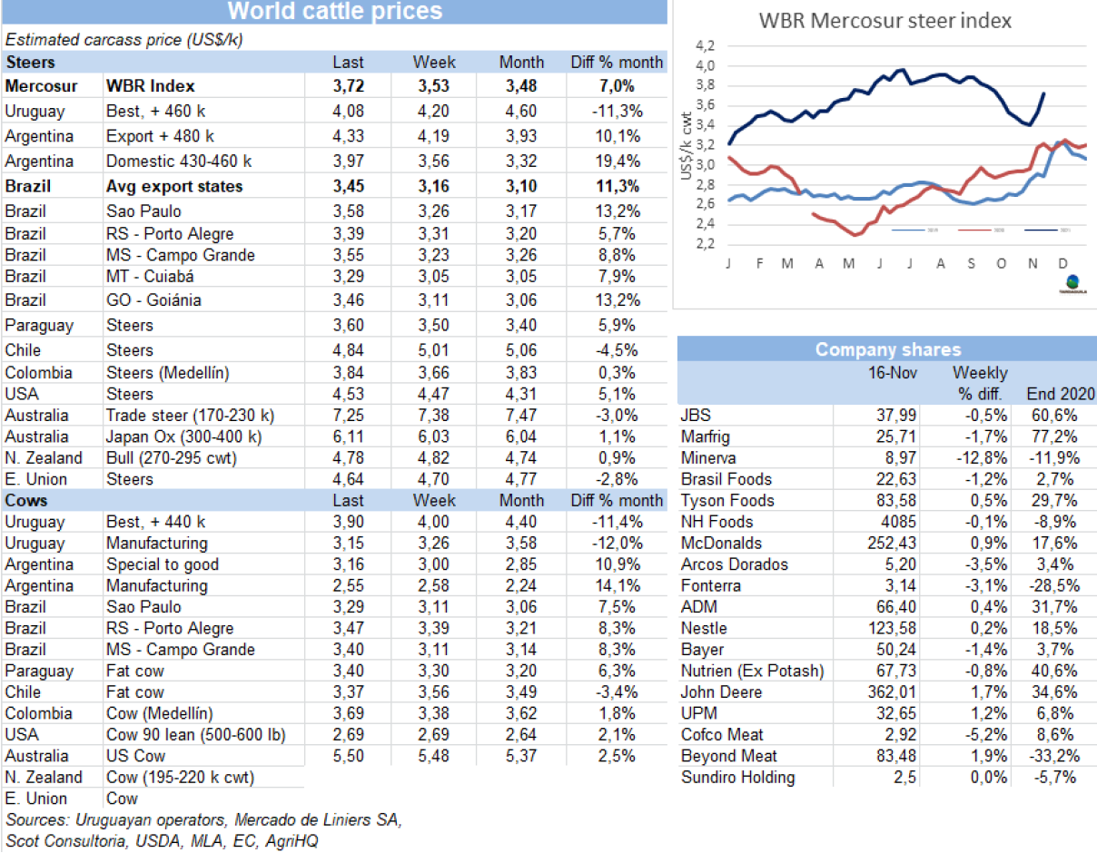本周隨著巴西國內(nèi)市場(chǎng)需求對(duì)巴西育肥牛價(jià)格產(chǎn)生的積極作用,以及阿根廷和巴拉圭牛價(jià)上漲,南方共同市場(chǎng)閹牛價(jià)格指數(shù)反彈,較上周上漲19美分至3.72美元/公斤,達(dá)九月末以來最高。由于巴西國內(nèi)需求的改善和育肥牛供應(yīng)的減少,巴西主要出口州育肥牛價(jià)格在一周內(nèi)上漲了29美分,達(dá)3.45美元/公斤。南美地區(qū)牛價(jià)還受到阿根廷和巴拉圭的拉動(dòng),阿根廷的供不應(yīng)求導(dǎo)致活牛參考價(jià)上漲14美分至4.33美元/公斤,使阿根廷的牛價(jià)上漲至南美地區(qū)最高。巴拉圭方面對(duì)以色列的出口需求和降雨的到來使牛價(jià)從上周的下行開始有所回升,唯一一個(gè)牛價(jià)下行的國家是烏拉圭,上周由于工會(huì)罷工,草飼牛需求有所緩解,參考價(jià)約達(dá)4.08美元/公斤。