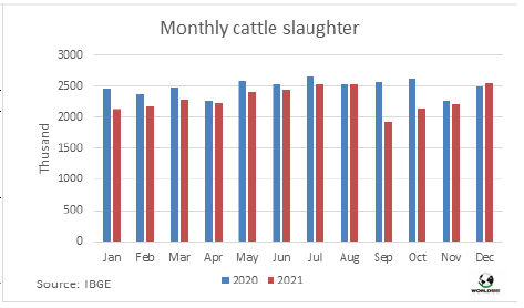 根據(jù)巴西地理和統(tǒng)計研究所(IBGE)的數(shù)據(jù),巴西活牛生產(chǎn)商2021年屠宰了2754萬頭牛,比前一年下降了7.8%。IBGE在一份報告中表示:“這一結(jié)果反映出牛屠宰量連續(xù)第二年下降,延續(xù)了自2020年初以來觀察到的保留存欄情況?!迸c去年同期相比,唯一一個屠宰量增加的月份是12月,增加了4萬頭,而降幅最大的是9月,減少了65.1萬頭,由于馬托格羅索州和米納斯吉拉斯州出現(xiàn)了非典型的瘋牛病病例,出口禁運。犢牛平均價格創(chuàng)紀(jì)錄的上漲刺激了母牛的保留存欄。2021年全年母牛屠宰的量931萬頭,是自2004年以來的最低記錄?!?今的年牛屠宰數(shù)量較2020年減少了234萬頭,27個州中23個州屠宰量都有減少。馬托格羅索州屠宰量下降最為顯著,下降了633.91萬頭。南馬托格羅索州屠宰量減少了43.89萬頭。2021年馬托格羅索州仍以16.2%的占比保持屠宰量領(lǐng)先地位,其次是戈亞斯州(占比10.8%)和南馬托格羅索州(占比10.7%)。2021年第四季度,衛(wèi)生檢查機(jī)構(gòu)注冊下的屠宰廠屠宰量約690萬頭,較2020年第四季度下降了6.4%,達(dá)2008年以來最低。與2021年第三季度相比,屠宰量下降了0.9%。