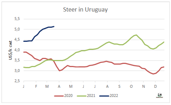 由于貨幣匯率走強(qiáng),南美地區(qū)美元牛價急劇上漲,主要是雷亞爾價格上漲。巴西貨幣本周升值近5%,帶動新興國家一籃子貨幣的復(fù)蘇。利率上升,加上巴西出口牛肉價格的上漲,推高了巴西牛價。盡管育肥牛雷亞爾價格有所下降,主要出口州牛價上漲了18美分至4.22美元/公斤。南美其他三國的牛價也有小幅上漲,本周烏拉圭特種閹牛價格上漲了5美分至5.15美元/公斤,阿根廷英國串種閹牛上漲了1美分至5.13美元/公斤。巴拉圭待宰牛價格也有上漲,因為人們預(yù)期盡管西方制裁給對俄羅斯的出口業(yè)務(wù)增加了難度,巴拉圭還可以向俄羅斯出口一些牛。本周待宰牛價格上漲了10美分至3.40美元/公斤。