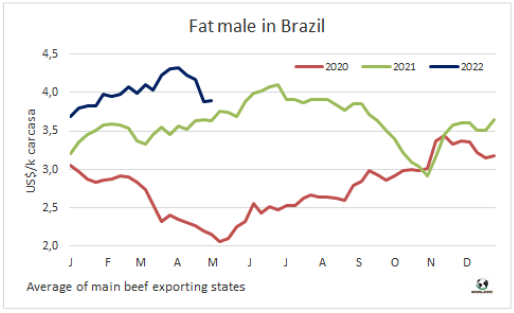 巴西育肥牛價格連續(xù)七周下跌后,市場達到了新的平衡。最近一周價格僅下跌了1雷亞爾/15公斤,主要出口州育肥牛價格參考價291雷亞爾/15公斤。需求方面,在周末母親節(jié)的額外需求的加持下,圣保羅批發(fā)市場銷售情況不錯。草飼牛的供應增長,給市場帶來了一些壓力,預計五月前兩周市場將保持穩(wěn)定。