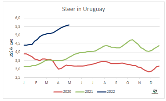 對巴拉圭來講智利進口市場保持堅挺,19切和20切全牛參考價6600-6700美元/噸,與7天前的市場相比變化不大。巴拉圭牛價穩(wěn)定,沒有必要給市場施壓。智利方面有對于美元價值上漲的擔憂,當前1美元對850比索,最近一個月匯率上漲了9%,對進口貿易不利。