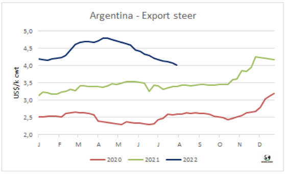 七月平均牛肉出口價格下跌了4%