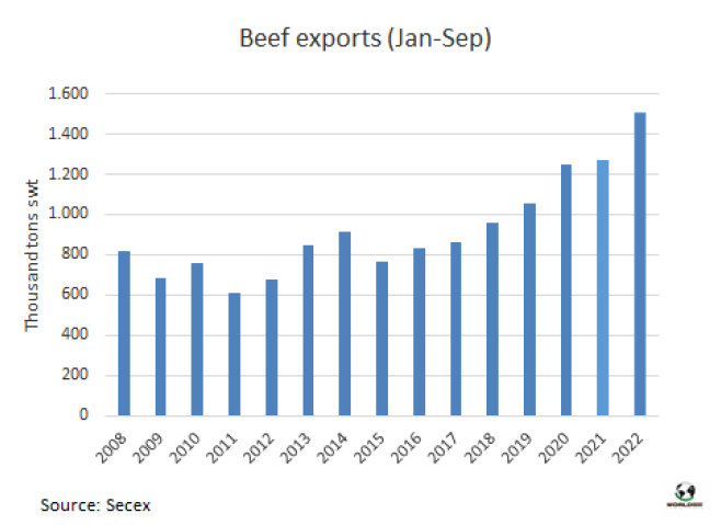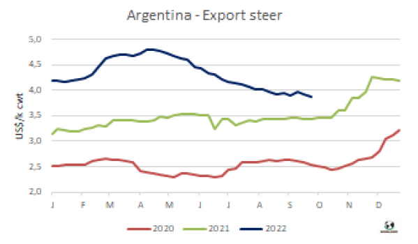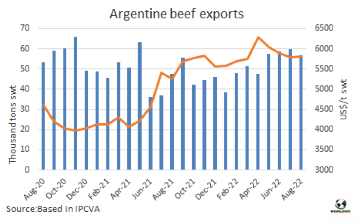 8月阿根廷對中國的出口大幅下降,為4.16萬噸,其中8700噸是帶骨牛肉。冷凍去骨牛肉對中國出口量3.28萬噸,環(huán)比下降20%。中國在阿根廷肉類出口中的份額從上個月的82%下降到8月份的73%。阿根廷牛肉出口商會指出:“2022年8月出口到中國的去骨牛肉的平均價格略高于5500美元/噸,與去年5月的5900美元/噸的峰值相比有明顯下降”。