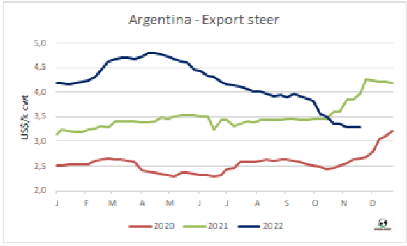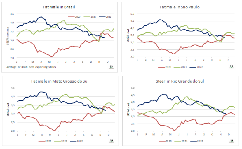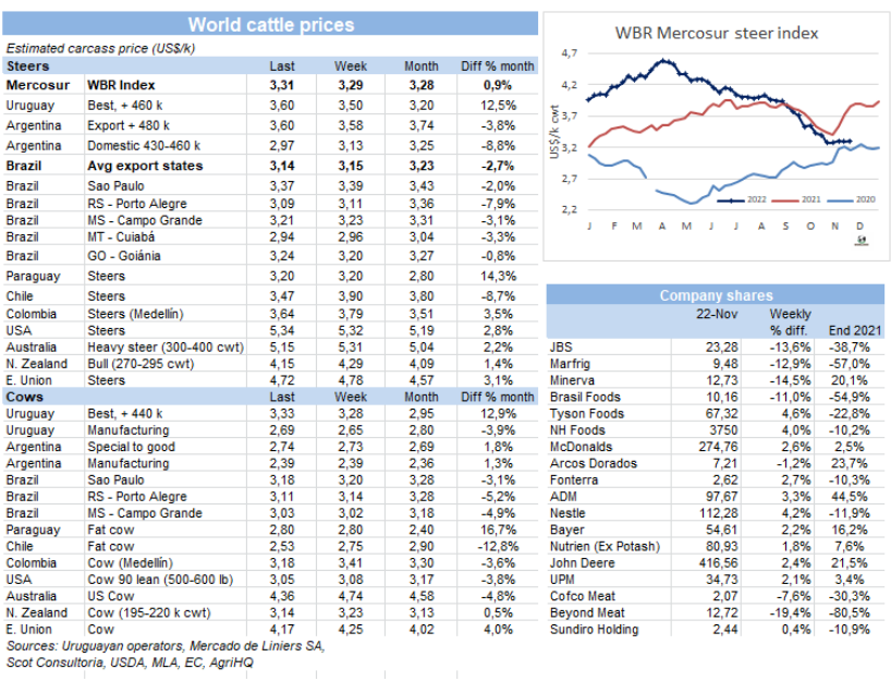 今年下半年,南美國家牛肉價格下跌,但谷物價格仍居高不下。這將導致南美國家減少育肥投入,從而導致2023年前幾個月育肥牛供應下降。烏拉圭集約化養(yǎng)殖者協(xié)會(Aupcin)主席álvaro Ferrés告訴WBR,“有些人開始擔心2023年第一季度供應減少。如果未來幾個月牛價上漲,育肥場的供應狀況可能會改善,”從成本方面來看,由于動物飼料價格仍維持在高位,且雨后預備牛價格穩(wěn)定,預計不會出現(xiàn)大幅下降??紤]到草飼牛的銷售旺盛,直到年中,以及由于缺水而導致的牧草狀況不佳,Ferrés認為“必須進行谷飼育肥才能得到成品牛?!蹦厦赖貐^(qū)其他國家情況也類似。巴西方面,根據(jù)Cepea的說法,“目前的情況不適合圍欄牧場育肥?!卑⒏⒎矫妫帮暳蠄龅默F(xiàn)狀很差,”阿根廷育肥場協(xié)會(CAF)主席Fernando Storni告訴WBR。巴拉圭方面,近幾個月來育肥牛價格的暴跌導致飼養(yǎng)場每頭牛虧損100至200美元,因為架子牛的采購價格非常高。作為全球牛肉的主要供應商,南方共同市場在2023年的頭幾個月可能會出現(xiàn)供應減少,特別是牛齡較小的育肥牛。這是一個很重要的信息,因為巴西只能向中國出口屠宰時牛齡小于30個月的牛肉。