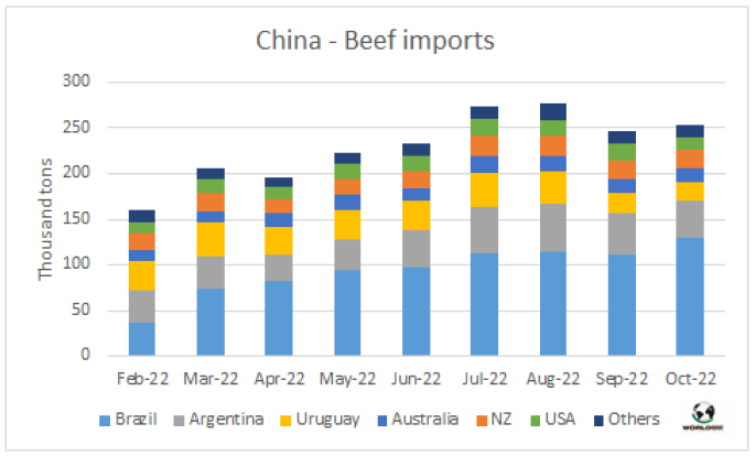 根據(jù)海關報告的數(shù)據(jù),中國10月進口牛肉253,717噸,略高于9月5000噸,盡管低于7月和8月進口量,7,8月進口量超過27萬噸。10月進口量中幾乎都是冷凍牛肉,冰鮮牛肉只有3902噸。在249,816噸冷凍牛肉中,30,689噸是帶骨牛肉,平均進口價格為3,291美元/噸,218,666噸是去骨牛肉,平均進口價格為6,884美元/噸。帶骨牛肉的主要供應國是烏拉圭,約9087噸,平均價格2982美元/噸。去骨冷凍牛肉的主要供應國是巴西,約130168噸,平均價格6,681美元/噸。此外,牛副到港量2392噸,烏拉圭也是主要供應國,從烏拉圭進口約781噸。盡管從澳洲出口量減少,考慮到9月和10月從南方共同市場發(fā)貨的數(shù)量,預期11月的牛肉進口量仍然很大, 11月進口量可能略低于10月。