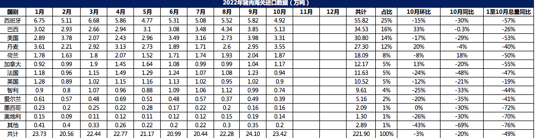 2022年1-10月冷凍豬肉進(jìn)口數(shù)據(jù)