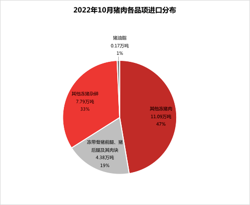 從進(jìn)口品項(xiàng)看,其他凍豬肉和其他凍豬雜碎進(jìn)口量之和占10月豬肉進(jìn)口量的81%。