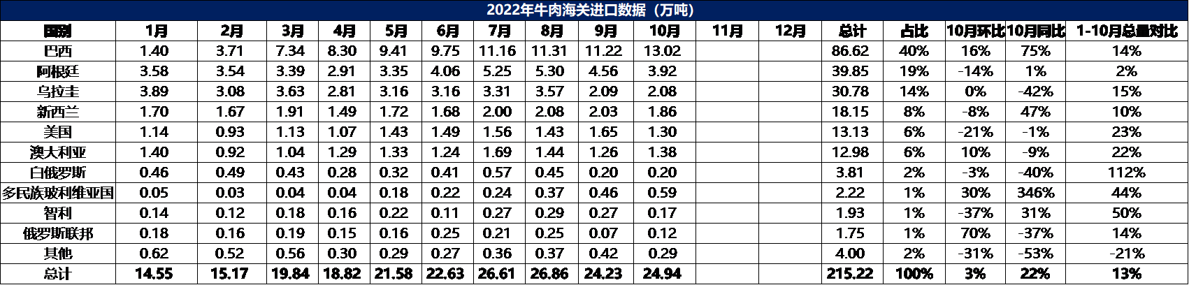 2022年1-10月冷凍牛肉進(jìn)口數(shù)據(jù)