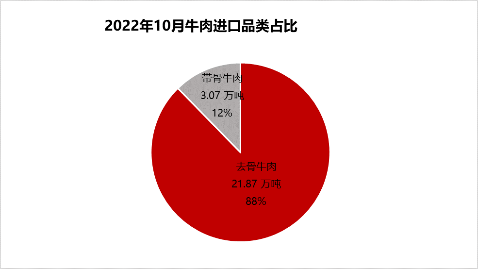 從進(jìn)口品項(xiàng)看,帶骨牛肉進(jìn)口量3.07萬(wàn)噸,占比12%,去骨牛肉進(jìn)口量21.87萬(wàn)噸,占88%。