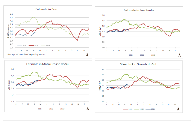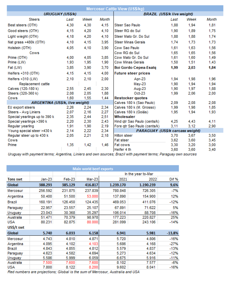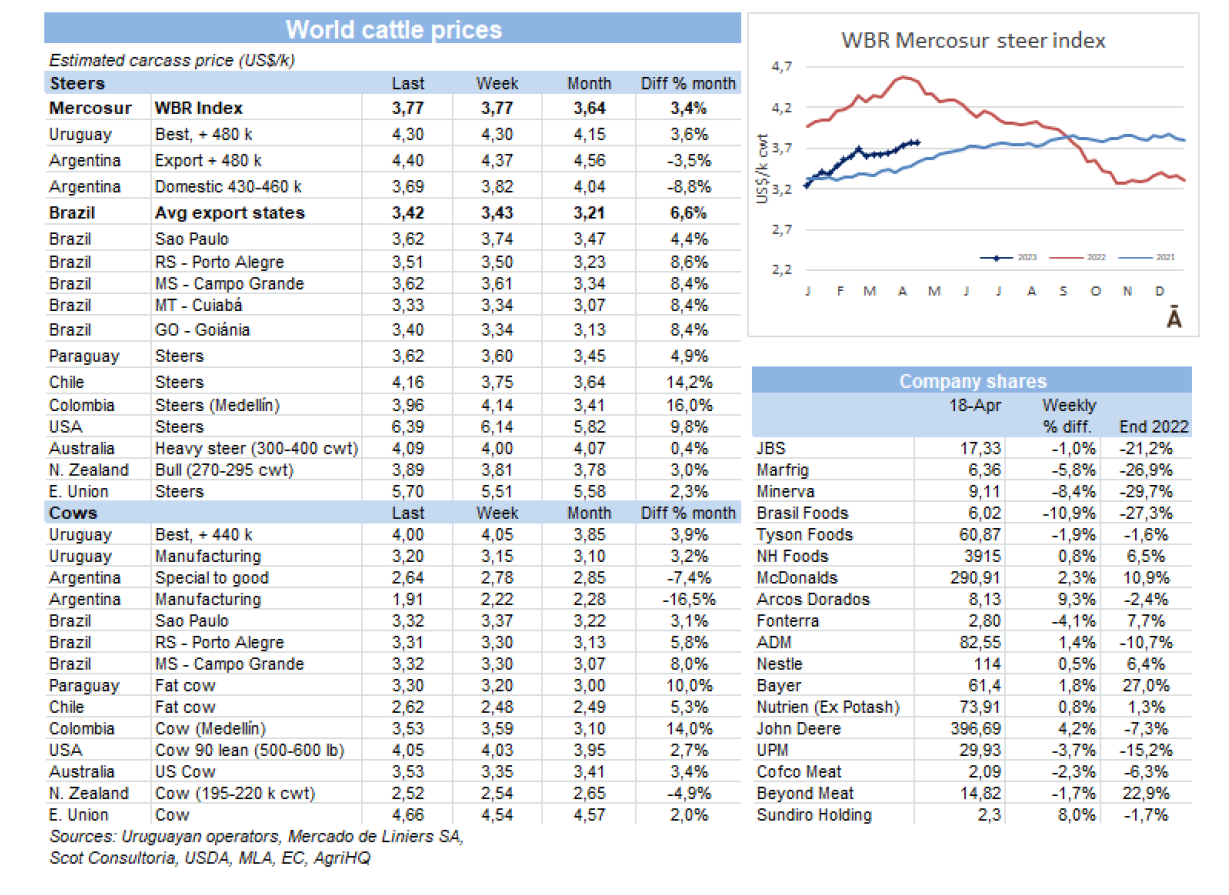 在巴拉圭,用于屠宰的雄魚(yú)本周從2美分上漲至3.62美元,而在烏拉圭,特殊牛種則保持穩(wěn)定在4.30美元每公斤。