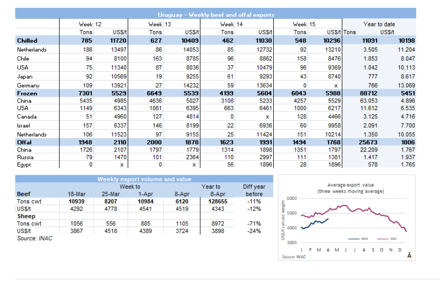 INAC報(bào)告說(shuō),有36740頭牛進(jìn)入工廠,其中16802頭是公牛(占總數(shù)的46%)和14488頭母牛(占總數(shù)的39%)。本周產(chǎn)量最高的工廠是Marfrig-Tacuarembó ,有4961頭牛在加工,遠(yuǎn)遠(yuǎn)超過(guò)Marfrig-Cledinor(3166頭)和Minerva-Pulsa(2957頭)。在這一周里,Marfrig屠宰了12900頭牛,Minerva屠宰了7570頭牛。4月上半月,屠宰了68019頭牛,比2022年同期減少了34%。