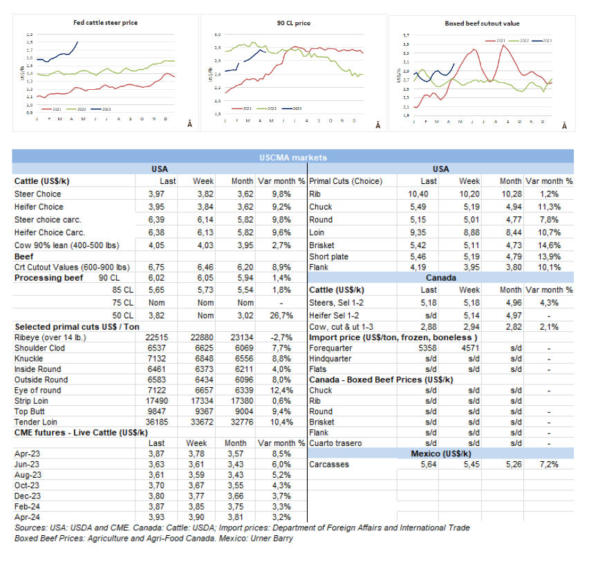 對(duì)犢牛季節(jié)的預(yù)期也有助于圍欄內(nèi)動(dòng)物數(shù)量的增加;今年第一季度有116萬(wàn)頭牛進(jìn)入圍欄。因此,在 1月份下降 2% 之后,飼養(yǎng)場(chǎng)的牛在2月份增長(zhǎng)了3%,在3月份增長(zhǎng)了11%。報(bào)告稱:“截至2023年3月31日,牛存欄量比去年同期高出16%。