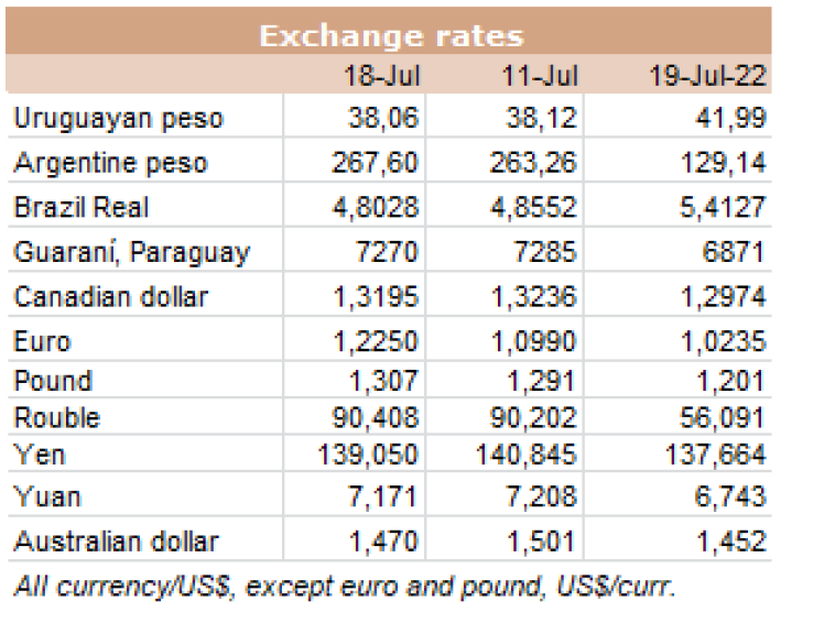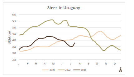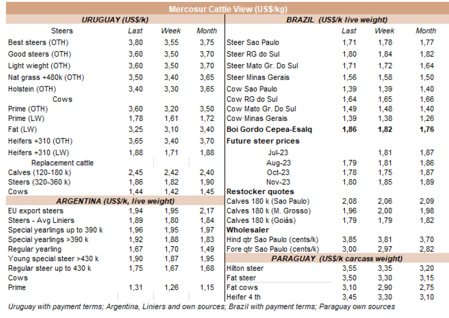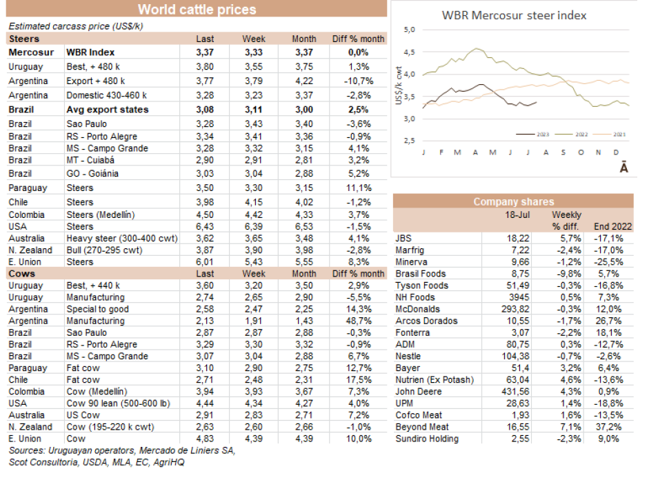 世界牛肉報(bào)告顯示過去一周南方共同市場閹牛價(jià)格上漲4美分至3.37美元/公斤。牛肉屠宰量增加,烏拉圭上漲了7%,巴拉圭上漲了6%,阿根廷市場保持穩(wěn)定,而巴西出口平均數(shù)減少了1%(-3美分)至每公斤3.08美元。雷亞爾對美元的升值(+1%)阻止了該地區(qū)牛價(jià)格的進(jìn)一步下跌。
