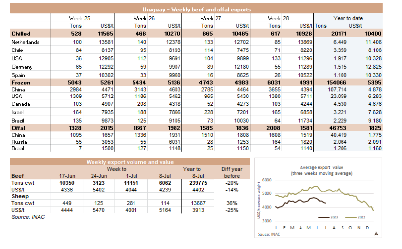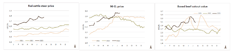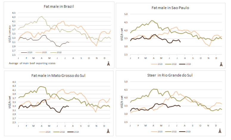 根據(jù)巴西環(huán)境與分析研究所上周發(fā)布的數(shù)據(jù)顯示,由于季節(jié)性調(diào)整,5月份的零售額比4月收縮了1%。與2022年5月相比,零售額也下降了1%,遠(yuǎn)低于分析專家關(guān)于1.6%復(fù)蘇的預(yù)期。預(yù)計(jì)7月份出口量將低于16萬噸。上周牛肉出口達(dá)到3.925萬噸,周增長5.01%。7月前十個(gè)工作日,牛肉出口約7.663萬噸,平均0.766萬噸/天,比2022年7月的日均水平低3.72%。Agrifatto稱:“通常情況下,前兩周的出貨量是最大的,7月迄今為止的統(tǒng)計(jì)數(shù)字表明,本月16萬噸的出口預(yù)期很難完成。