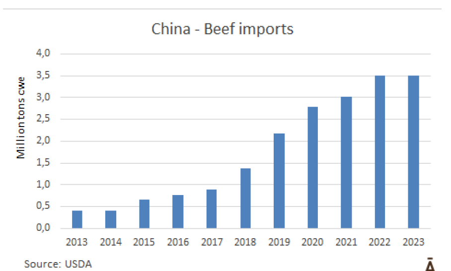 盡管中國正在經(jīng)歷經(jīng)濟(jì)困難,但美國農(nóng)業(yè)部(USDA)仍將今年牛肉進(jìn)口預(yù)期維持在350萬噸,與2022年持平。