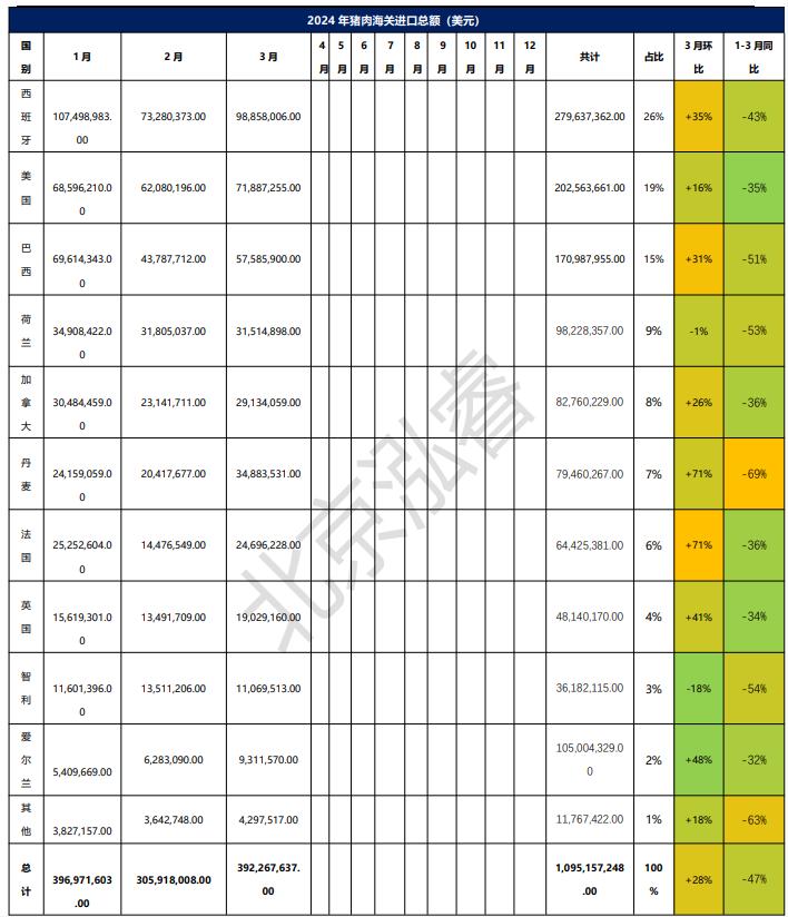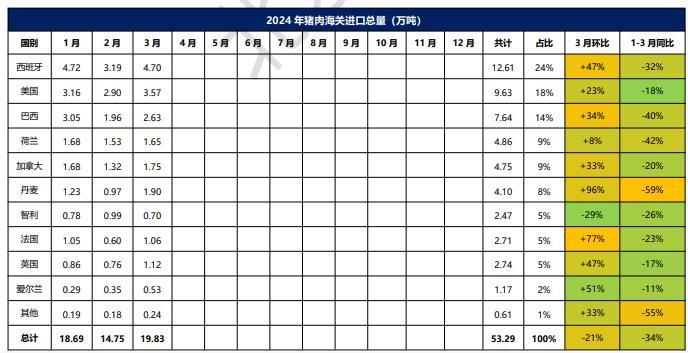 2024年1-3月冷凍豬肉進(jìn)口概況