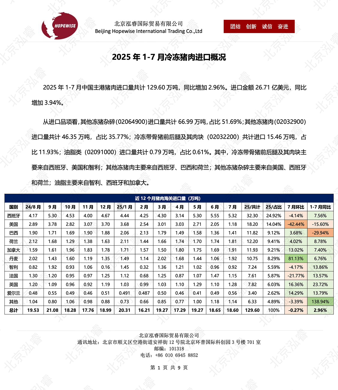 2025 年 1-8 月冷凍豬肉進口概況