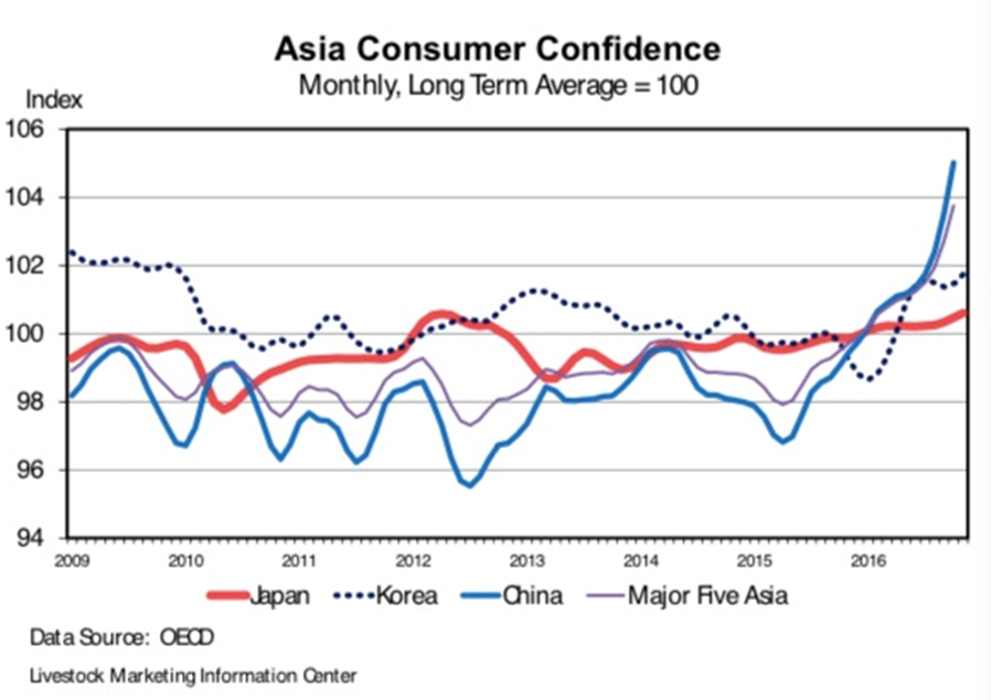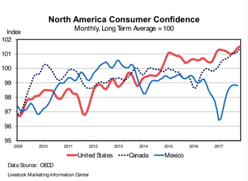 消費(fèi)者信心與經(jīng)濟(jì)增長(zhǎng)密切相關(guān),相對(duì)強(qiáng)勁的數(shù)字預(yù)示著紅肉需求量的增長(zhǎng)。在最近六年里,美國(guó)消費(fèi)者信心趨勢(shì)走高。美國(guó)消費(fèi)者信心指數(shù)(CCI),被作為經(jīng)濟(jì)合作與發(fā)展組織(OECD)的標(biāo)準(zhǔn)和指標(biāo),可見(jiàn)下附圖表1。該圖表來(lái)自圣路易斯聯(lián)邦儲(chǔ)備銀行數(shù)據(jù)庫(kù)(弗萊德,數(shù)據(jù)截止到2017年10月)。經(jīng)濟(jì)合作與發(fā)展組織(OECD)11月的美國(guó)消費(fèi)者信心指數(shù)(CCI)為101.5,是自2000年12月以來(lái)最高的一個(gè)月。2009年2月,是上次經(jīng)濟(jì)衰退的最低點(diǎn),美國(guó)消費(fèi)者信心指數(shù)(CCI)為96.7.